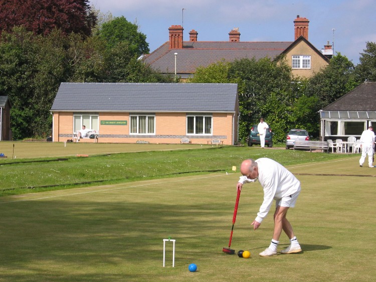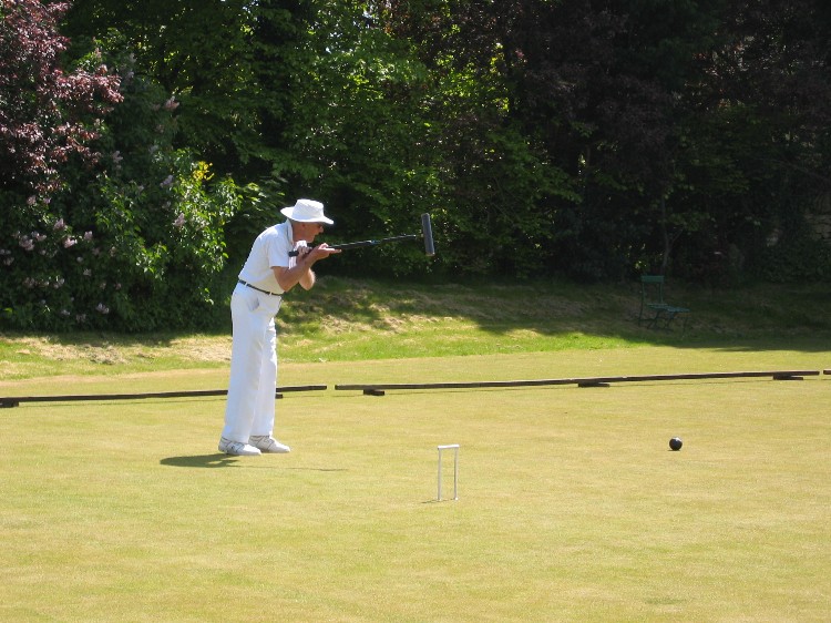 Roger Jenkins approaching 4 back on lawn 7, with the CA Office in the background